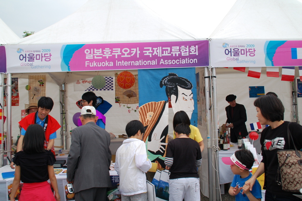同事業は釜山広域市国際交流財団が主催するもので、福岡市からブースを出展し、当日は現地の福岡市派遣職員とボランティアスタッフで対応しました。福岡ブースは大変な人気で、朝早くから多くの来場があり、途中、釜山市長もお見えになりました。ブースで配付していた記念品やパンフレットも午後にはほとんどなくなりました。