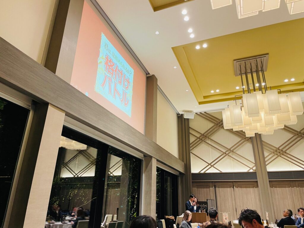 後半は、「ミュージックホール」から「迎賓館」に移動し交流会を開催いたしました。「毎週★KBM」の参加企業の皆さまが一堂に会する場であり、まずは会社説明を各社1分ほどで行っていただきました。また、着座の各テーブルごとのグループ対抗「格付けバトル」を行いました。これは「あそび」をビジネスソリューションとして提案・運営する会社㈱IKUSAにご協力していただいたものです。IKUSAは、企業・自治体・商業施設の課題を見つけ、「あそび」で解決するために生み出された100種類以上のサービスで、年間1000件以上の実績を誇るそうです。「あそび」の本質はチームを活性化させることという視点で、イベントの内容も課題に適用できるよう、リアル・オンライン・ハイブリッドなど多種多様なラインナップ、今回は年末のテレビでよくみる格付けバトルを行ったのですが、1つの問題に対し、各テーブルで考え、話し合うゲーム形式で、格付けに成功したテーブルでは大きな歓声が上がるなど、会場全体が大変盛り上がりました!!!今回の会場、高宮庭園茶寮はとても雰囲気がよく、お食事も、従業員の方々のサービスやお気遣いも素晴らしく、そのおかげで、会場内各所で名刺交換やお話が弾み、とても良い交流会になったのではないかと感じております。