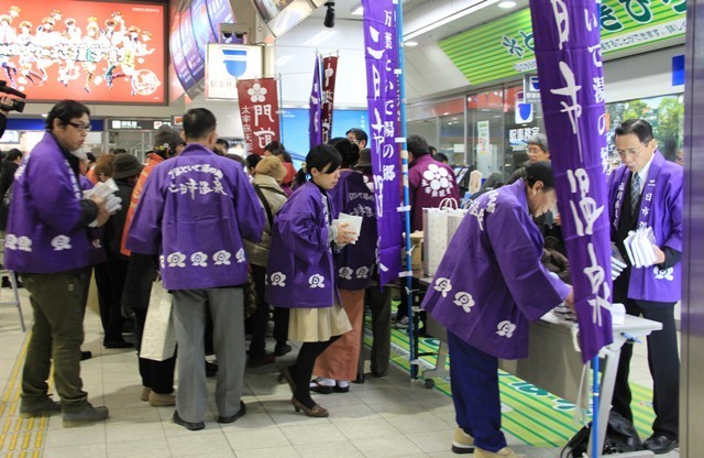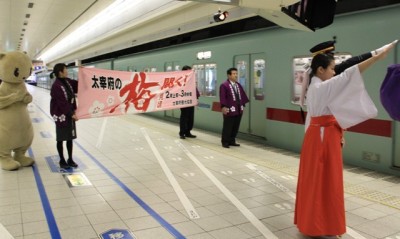 観梅時期の訪れを告げる『観梅列車』の運行PRが西鉄『福岡(天神)駅』コンコースで行われました。『太宰府天満宮門前まつり』に合わせ、福岡(天神)駅-太宰府駅間を運行する「観梅列車」。地元福岡の方々をはじめ、観光客の皆様に「梅の太宰府」を楽しんで頂こうと、法被姿のPRスタッフや、西鉄ICカードnimocaのイメージキャラクター『フェレット』によって、PRチラシや梅ヶ枝餅、にしてつ電車オリジナルグッズが配布され、たくさんの人で賑わいました。